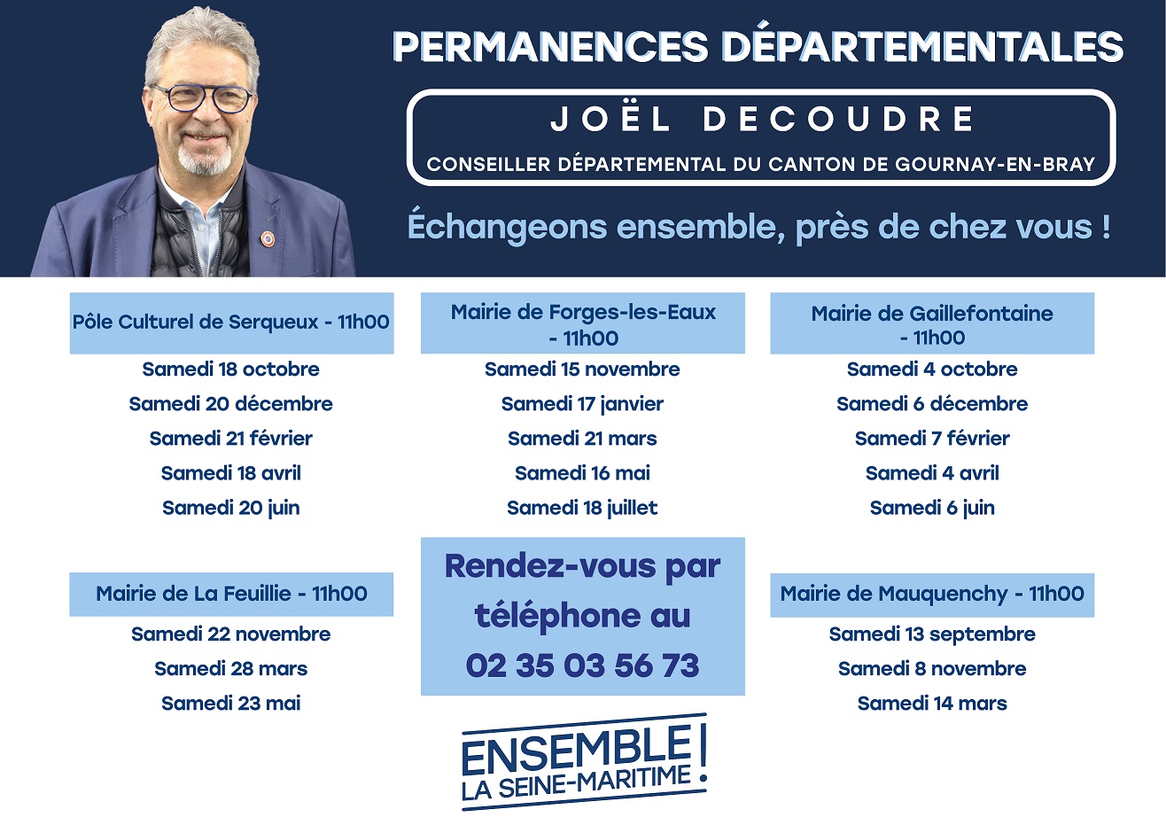 La permanence de Monsieur le Maire a lieu le Lundi de 15h00 à 18h00.